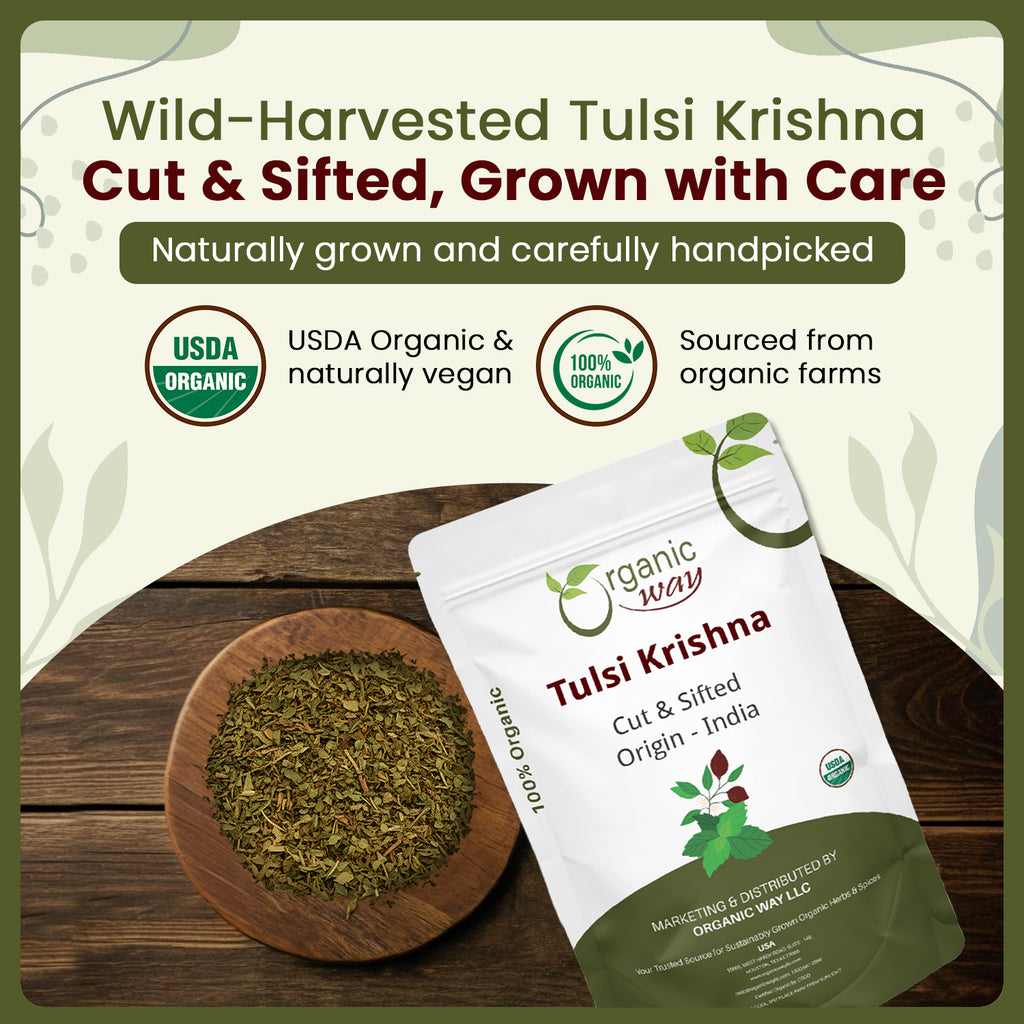 Our cut and sifted Tulsi (Krishna) means that the herb is not sold in whole form, but rather "cut" into smaller pieces and then "sifted" to remove the small pieces and dust that result from the cutting process.